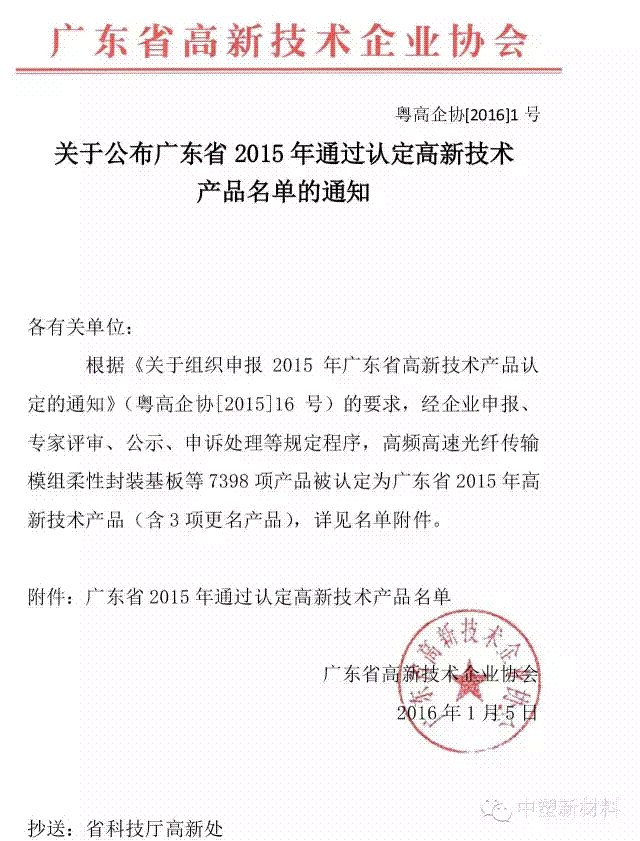 根据《关于组织申报2015 年广东省高新技术产品认定的通知》(粤高企协[2015]16 号)的要求,经企业申报、专家评审、公示、申诉处理等规定程序,本公司以下5项产品被认定为“广东省2015 年高新技术产品”。